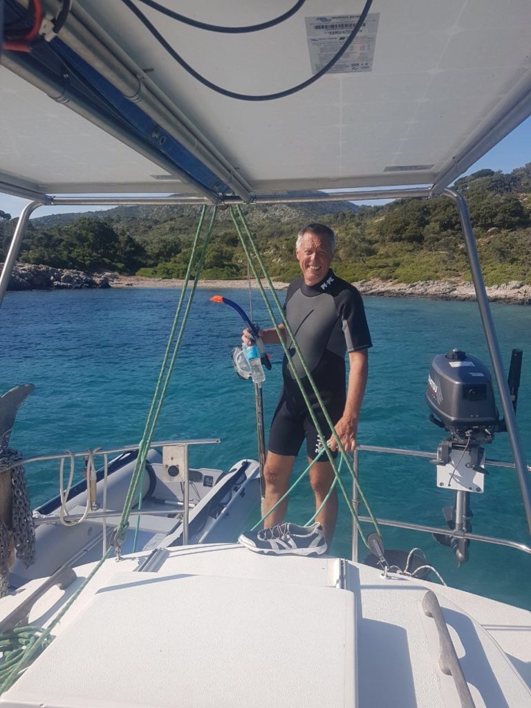 3 Stunden später lagen wir in einer Bucht der Insel Pelagonisou. Peter versuchte sich in Harpunieren. Da er nicht erfolgreich war, fuhren Peter und ich noch einmal mit dem Dingi und Zaparileine los. Wir aßen am Abend 8 köstliche Fische mit Erdäpfel und köstlichem Salat.